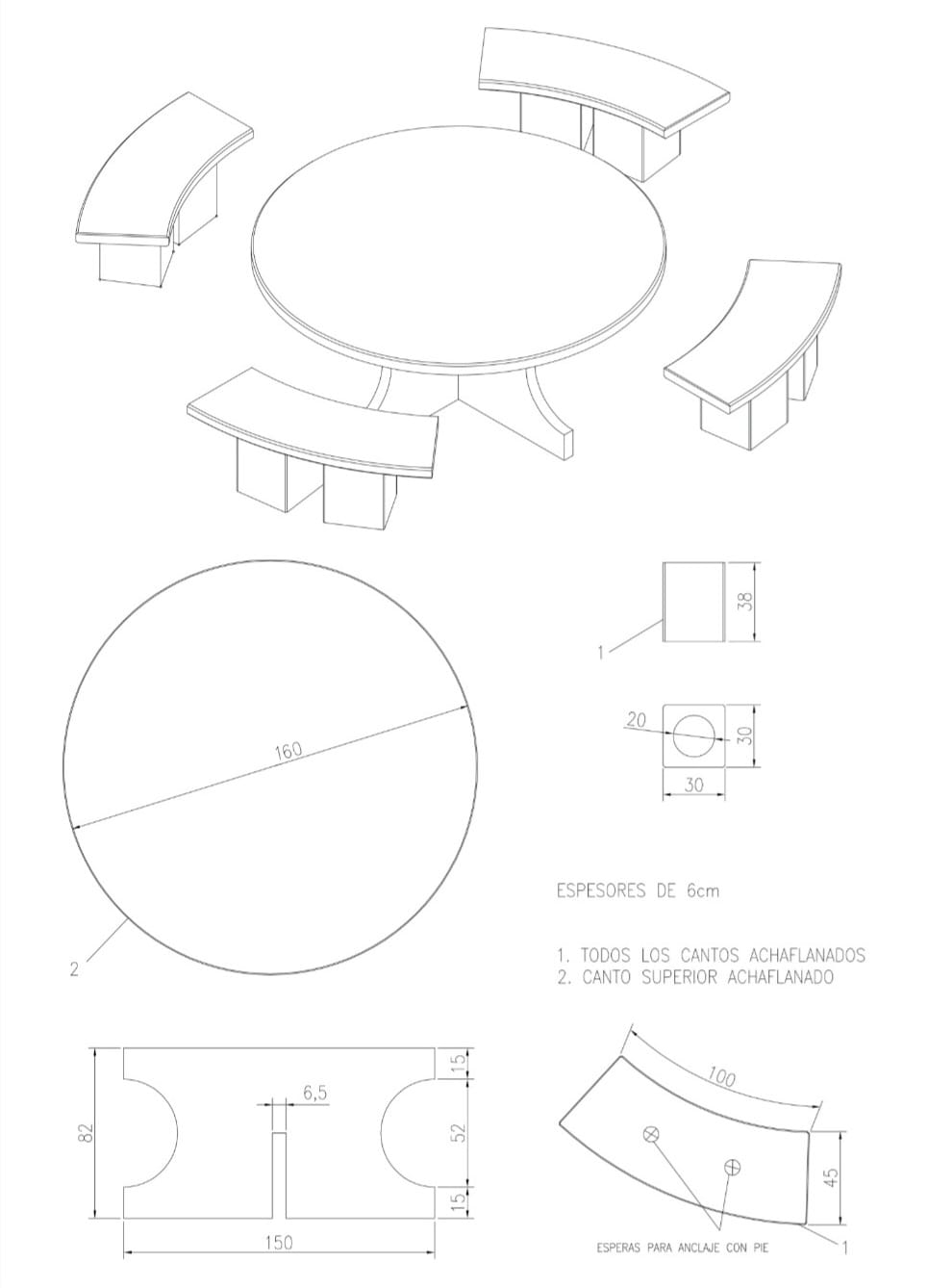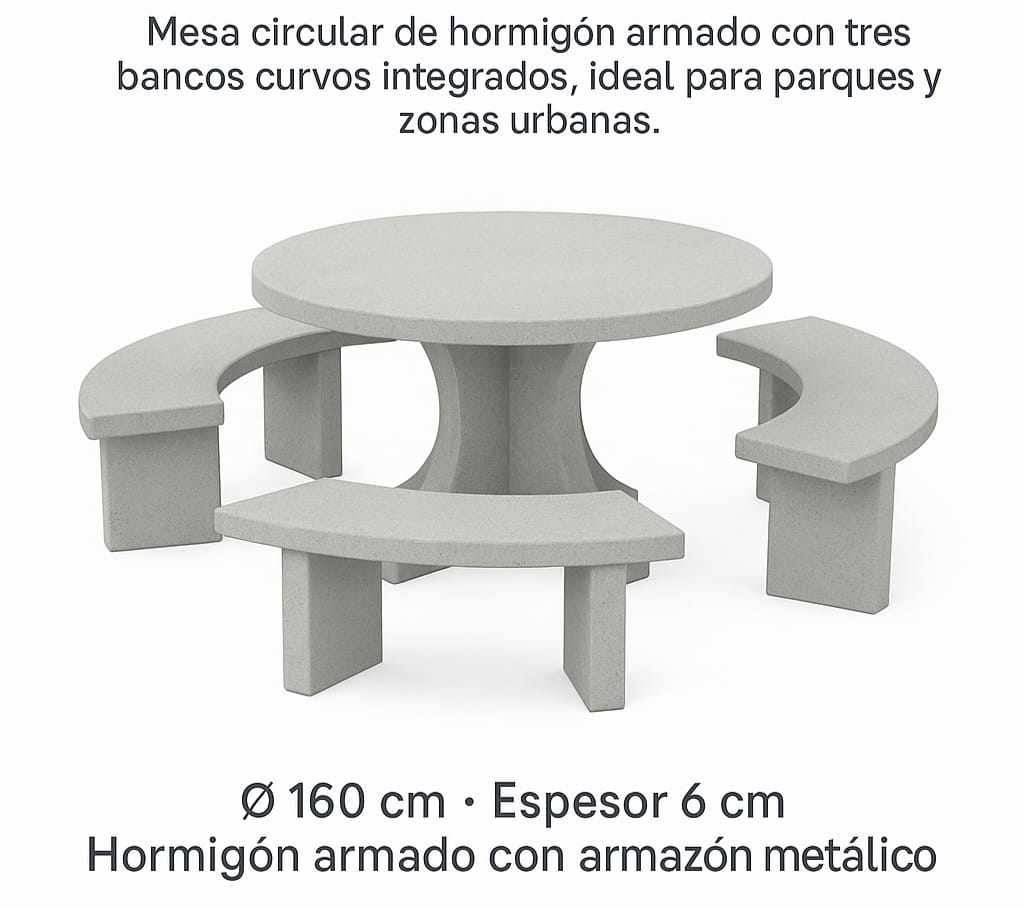 HORMIGON ARMADO CON ARMAZON METALICO DE DIAMETRO 160 ESPESOR 6 CM PESO 800 KILOS MESA CON 4 ASIENTOS DE 100X45 CM TODOS LOS BORDES ACHAFLANADOS