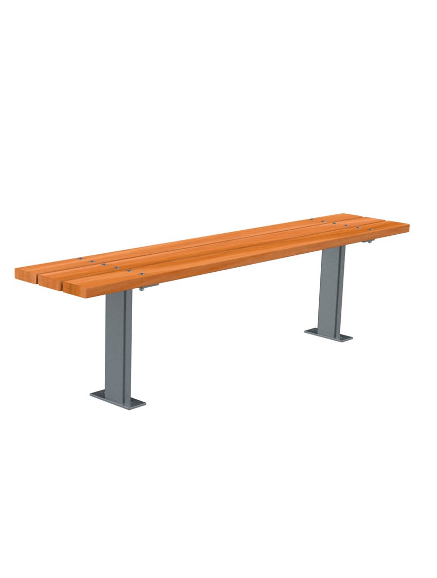 Banco fabricado en acero en patas y asiento de listones de madera de guinea certificada. Se sirve desmontado.