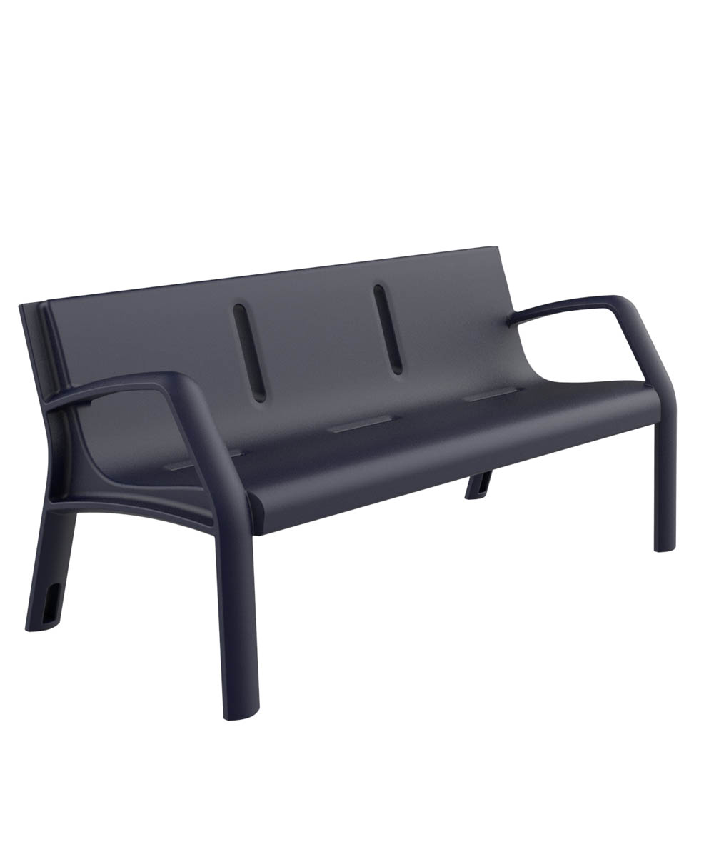 Banco fabricado con polietileno modelo Sanlúcar. Se trata de un banco con formas y estructuras tradicional, asemejando a los típicos bancos de fundición y madera. Pero fabricados con polietileno de la más alta calidad.