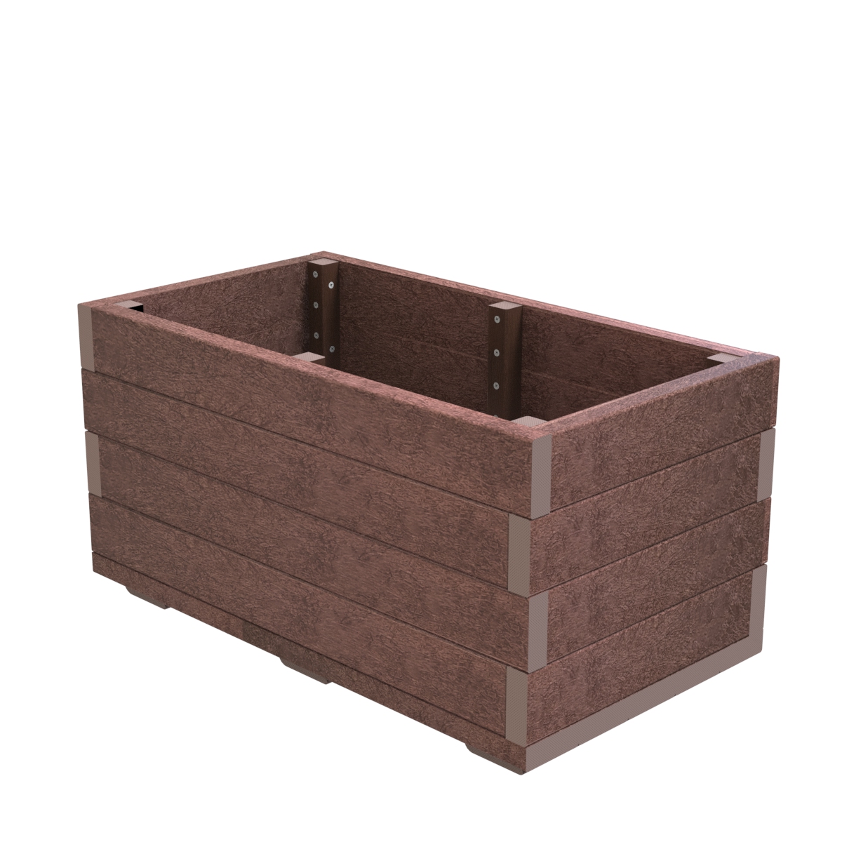 Jardinera fabricada totalmente con listones de plástico 100% reciclado. Materiales: Liston:Polímero reciclado mixto con origen doméstico post consumo,recuperado de los sectores industrial y agrícola. Sin mantenimiento. Tornillería en acero inoxidable. Medidas: 1000 x 550 x 516 mm. Capacidad:185 Litros.