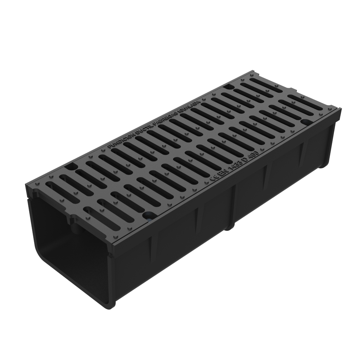 Conjunto de tramos, Canal y rejilla totalmente en fundicion, rejilla atornillada al marco. Cumple la norma EN 1433 D 400 resistencia