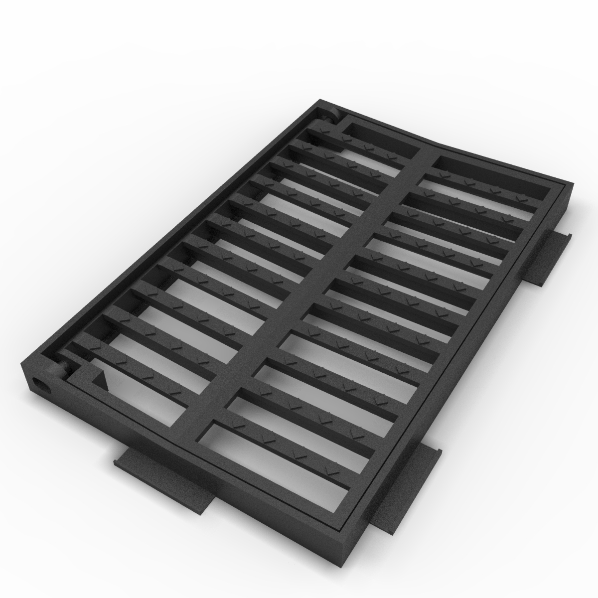 Reja y marco abatible con sistema antirrobo de 590X370X40 mm. en fundición dúctil para 25 TM de carga de rotura. 250KN