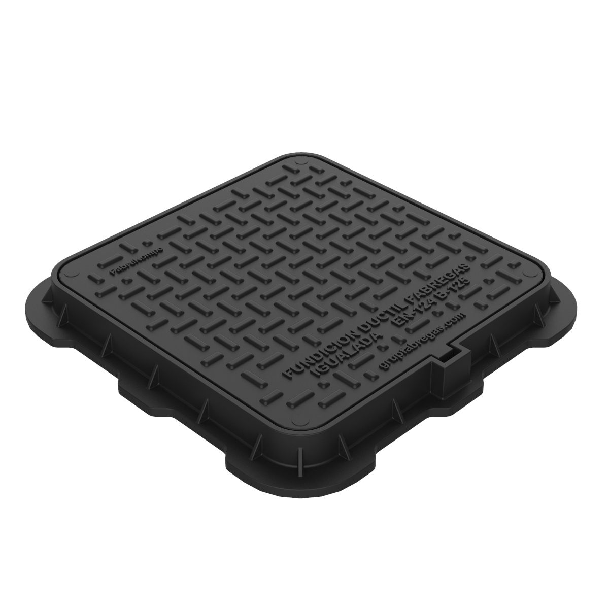 Tapa y marco en composite, medidas de marco 446x446x46, tapa 368x368x35 mm y paso libre 332×332 mm. Norma EN-124, Clase B-125.