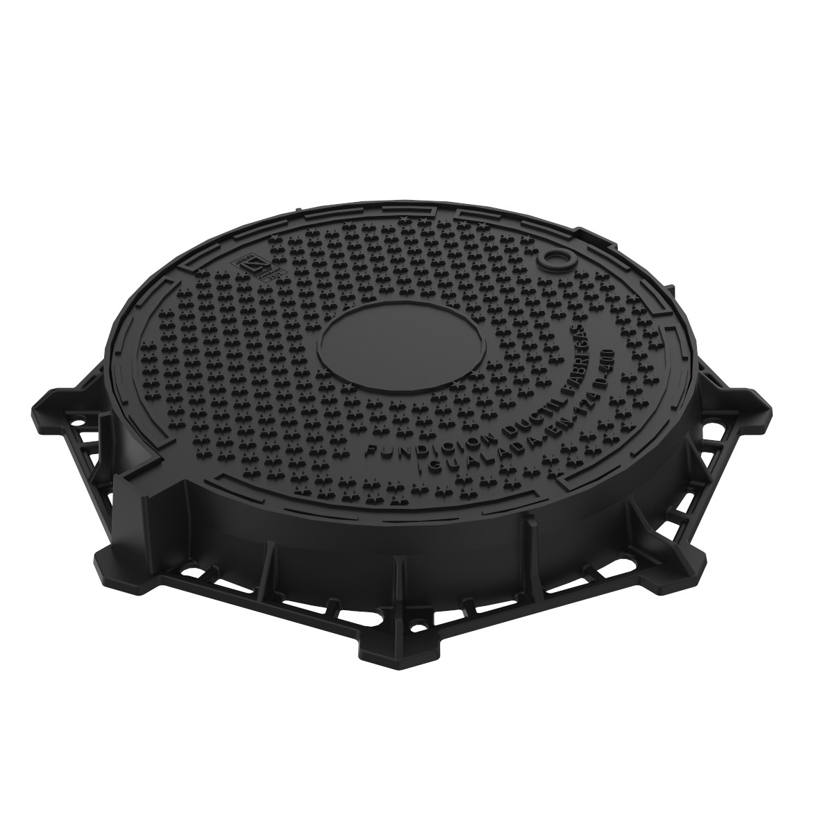 Conjunto de tapa y marco modelo Lucentum con medidas de la tapa: Ø 650 mm, Marco: Ø 850 x 100 mm, la tapa es abatible con junta de polietileno y cierre «Clic» con norma EN 124-2 y Clase D 400.
